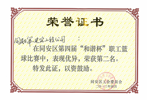 2013年同安區(qū)第四屆“和諧杯”職工籃球賽第二名